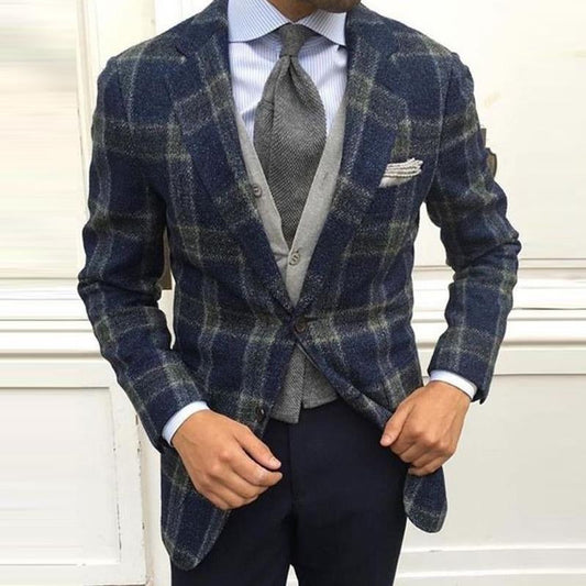 【24-hour shipping】Men's Classic Plaid Wool Blended Notched Lapel Single Breasted Patch Pocket Blazer 39821674M