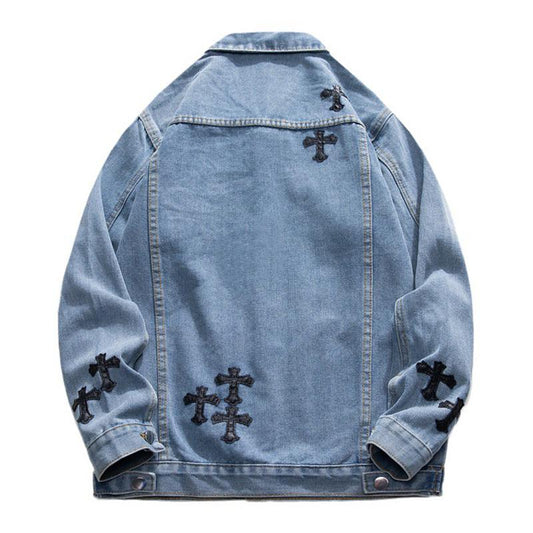 Men's Fashion Cross Patch Lapel Single Breasted Denim Jacket 84136194M