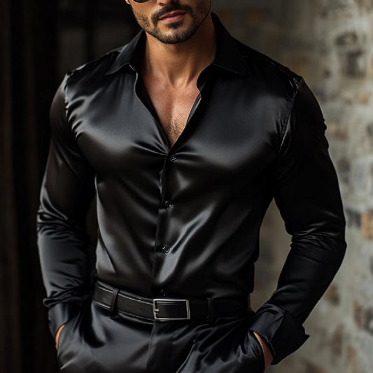 Men's Elegant Solid Color Satin Lapel Slim Fit Long Sleeve Shirt 17432911M