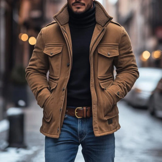 Men's Vintage Suede Fleece Collar Patchwork Multi-Pocket Zipper Coat 99704034M