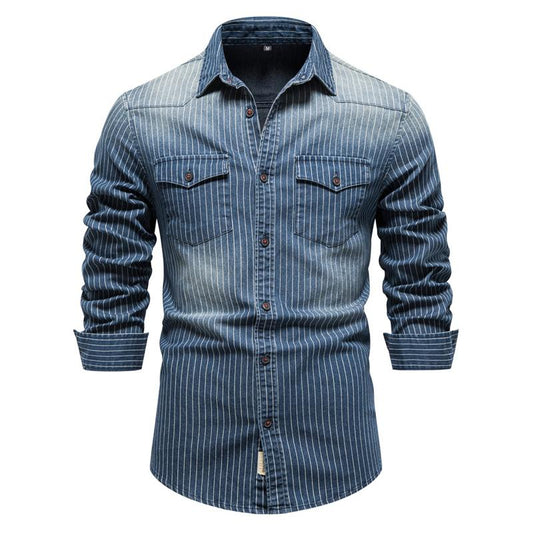 Men's Washed Distressed Striped Denim Shirt 98861733X