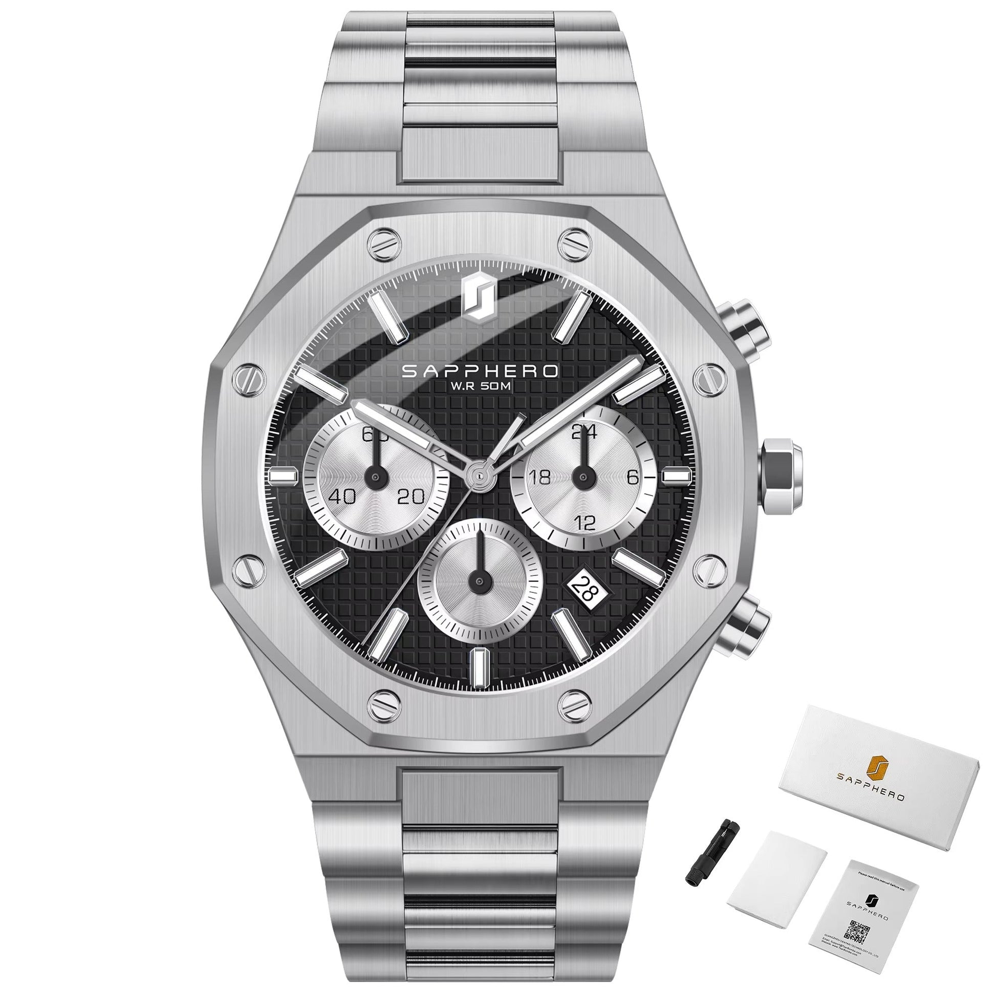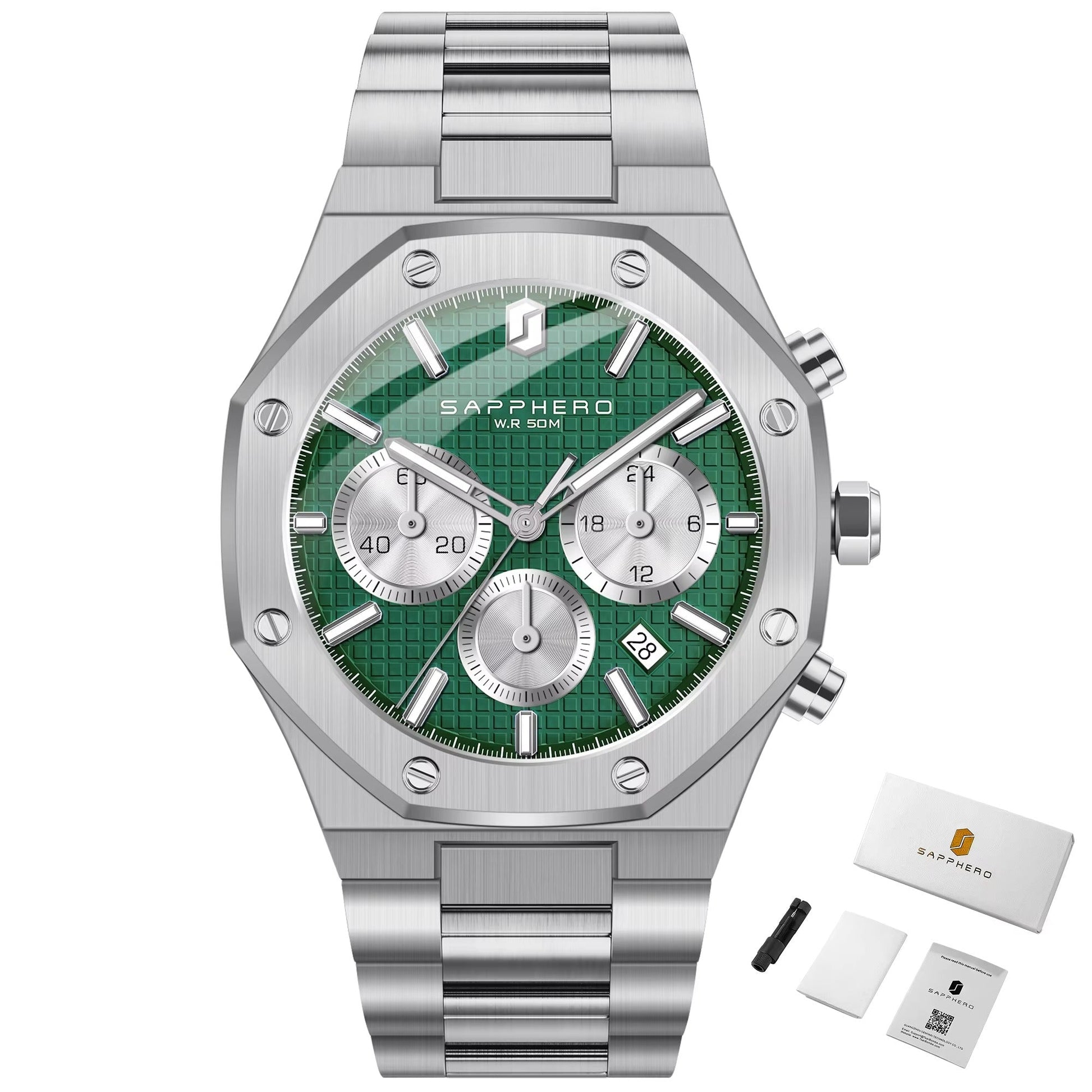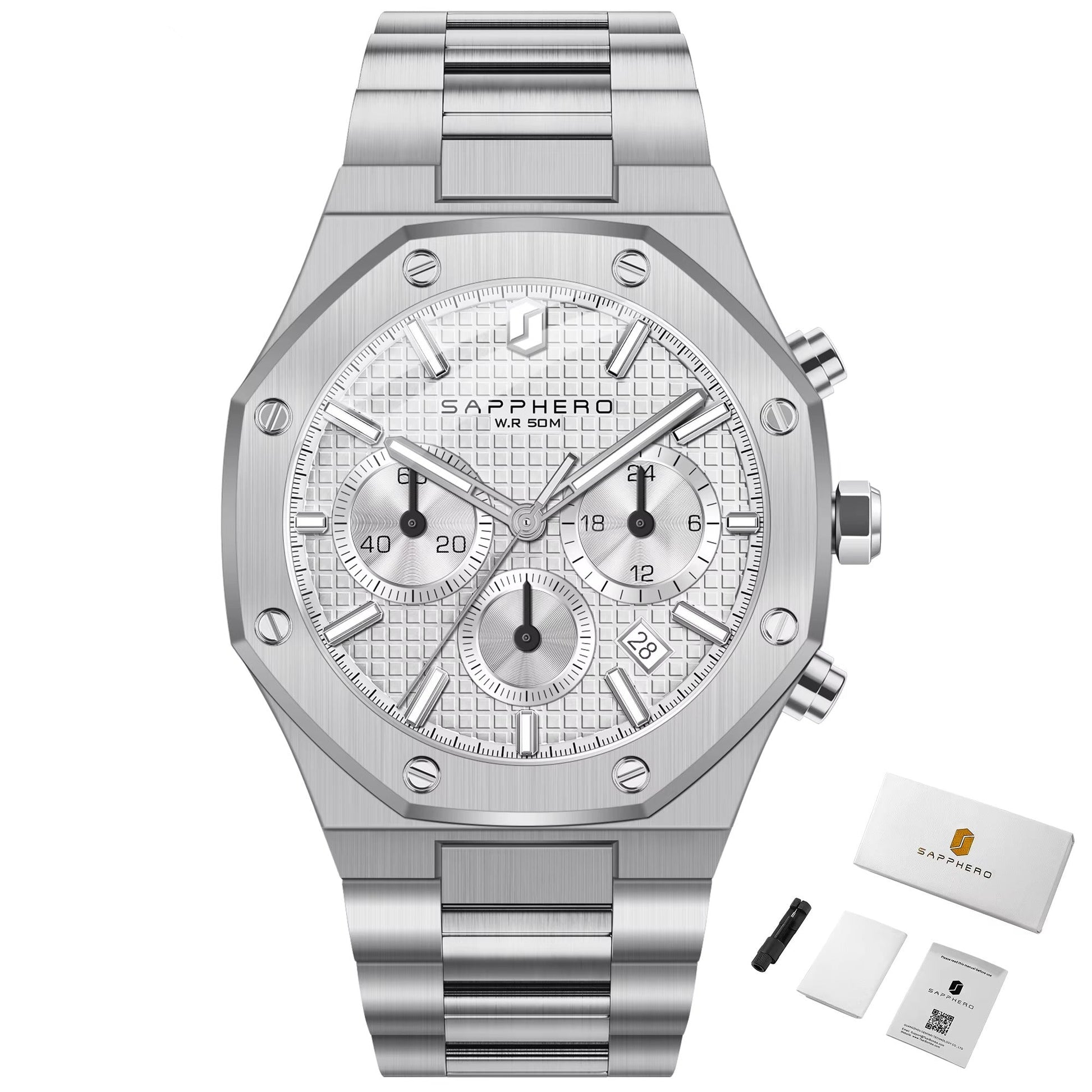 The distinctive octagonal bezel, integrated bracelet, and clean dial layout are inspired by legendary luxury sports chronograph designs often associated with the Royal Oak–style aesthetic.